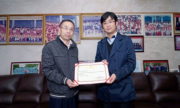 廣東省青基會劉揚(yáng)秘書長(右)向亞洲制藥王先偉總經(jīng)理(左)授予捐贈證書